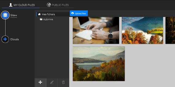 Estos archivos se almacenan en el espacio de almacenamiento de tu cuenta de SiteW. Puedes enviar nuevos archivos haciendo clic en Subir archivos para seleccionar un archivo en tu ordenador o arrastrándolo y soltándolo directamente en el administrador de archivos. Además, una función te ofrece la posibilidad de buscar archivos en otras plataformas de almacenamiento en línea (como DropBox, Google Drive, Facebook…).