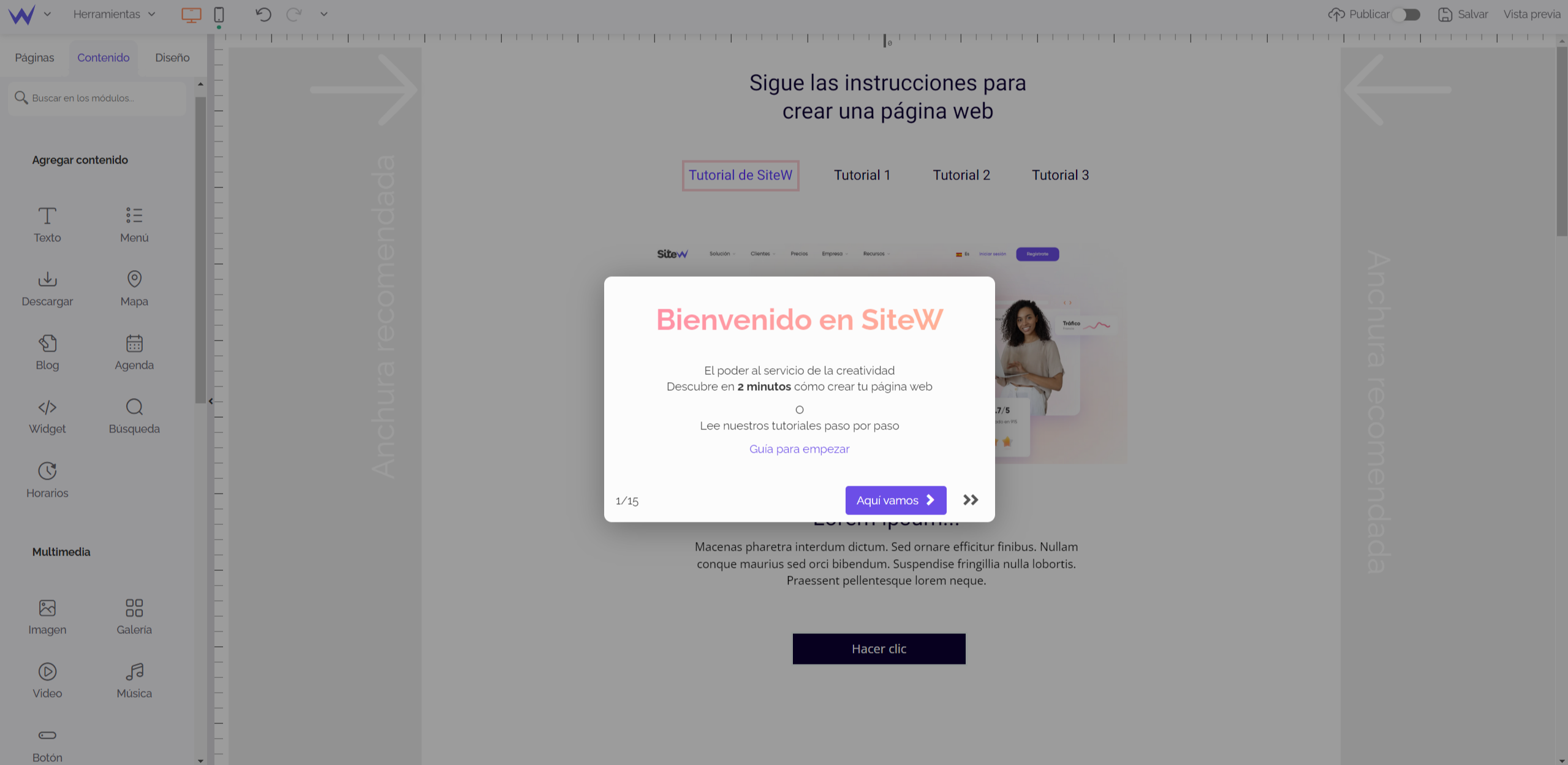 Crear su página web equivale a agregar texto, colocar imágenes, configurar el menú, agregar un mapa, etc. Para realizar todas estas acciones y muchas otras, encontrarás el módulo adecuado en la pestaña Contenido. No dudes en recorrer la lista de los módulos en el panel. ¡Descubrirás que es posible realizar (casi) todo con SiteW!